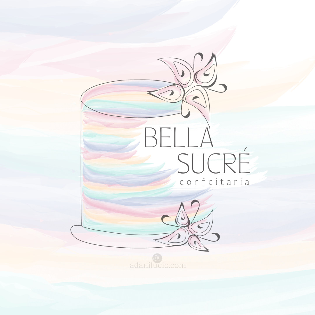 O logotipo da Bella Sucrè destaca um traçado à mão delicado, formando um bolo com linhas finas e pinceladas que fazem alusão ao espatulado, transmitindo a essência da confeitaria. A tipografia é suave e fluida, refletindo a estética dos bolos espatulados, que são verdadeiras obras de arte. A paleta de cores é alegre, composta por tons pastel, evocando a leveza e a doçura dos produtos oferecidos.