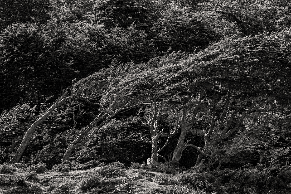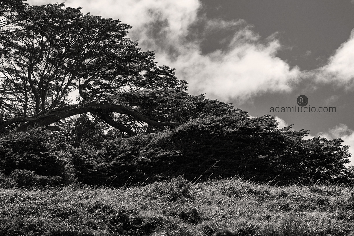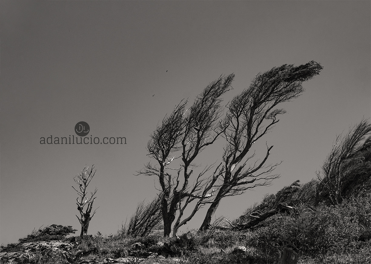 Histórias contadas pelo vento. O vento oeste que viaja do Chile e com persistência molda os que o atravessam. Tentei seguir seus rastros e as histórias que ele gentilmente revela… Sempre encontro meu caminho até as árvores, testemunhas silenciosas de eras passadas. Ao contemplar sua resistência ao vento, encontrei-me refletida nelas…